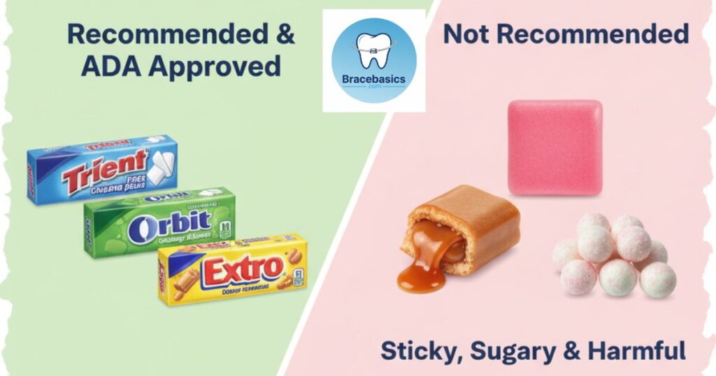 Dentists recommend Trident gum braces, Orbit gum braces, and Extra gum braces. These chewing gum brands safe for braces are less sticky and are even ADA approved gum. On the other hand, the worst gum for braces includes bubble gum, caramel gum, and sugary types.