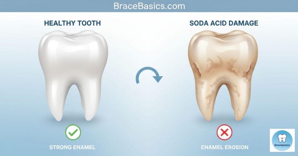 - Brackets and wires trap acid. Soda lingers around metal parts, accelerating enamel erosion with braces and increasing cavity risk.