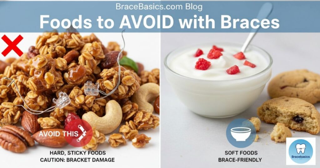 Avoid hard, crunchy, or sticky foods that can break or loosen brackets. Stay away from popcorn, nuts, hard candies, caramel, crunchy chips, and chewy breads. Also limit sugary foods, which stick to braces and lead to tooth decay if not cleaned properly.