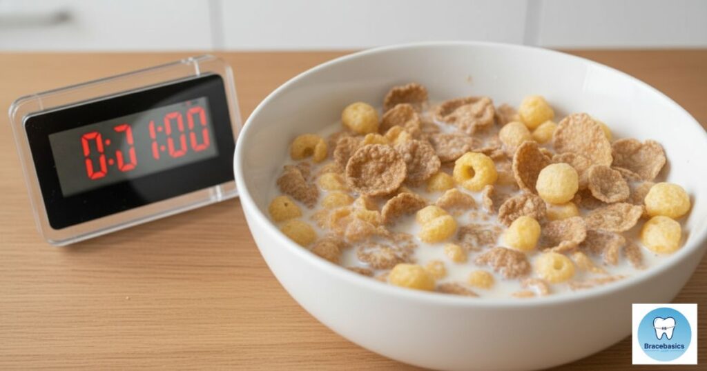 Always pour milk or liquid as soon as you add the cereal so the texture softens. Let the cereal soak a minute or two so the pieces soften before any chewing. If you have large chunks, break them into smaller bits to reduce stress on your braces. Use your back teeth for chewing and avoid biting directly with your front teeth. Eat slowly and mindfully so you catch problems early. After finishing, rinse your mouth well and brush/clean braces soon after to remove residual particles before they cause harm.