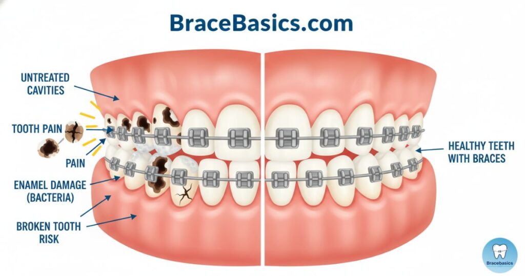 Starting braces with untreated cavities often leads to cavity-related tooth pain. Continuous pressure from orthodontic appliances can worsen enamel damage from bacteria, increase sensitivity, and raise the broken teeth risk. Tooth decay may progress rapidly under brackets, leading to serious orthodontic process complications.